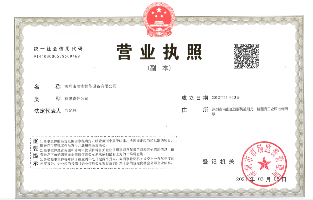 深圳市雨滴智能設備有限公司成立于2012年,占地2000平米。公司自成立以來,致力于將移動通訊和互聯網技術推廣到各個行業應用,此外涉足特種工業、醫療電源領域。公司現有80多人,其中研發人員50多人,擁有一位資深博士和三位專家級碩士,屬于以研發為主導的技術型公司,擁有強大的研發實力和配套的技術資源,可以滿足客戶多樣的定制需求,更能保證客戶項目的順利進行。