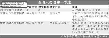 據悉,按廣州市規定,暫住證收費主要包括三個部分,一是IC卡工本費,二是每月9元暫住期間的勞務調配費(該筆費用收取對象為使用流動人員的用工單位,不能以任何方式向流動人員個人征收),三是每月2.5元暫住期間的治安聯防費。免收暫住證工本費后,廣州對流動人員的合法收費只剩治安聯防費2.5元/月(從居住第7個月起繳交),如發現違規收費的現象,流動人員可向市物價部門投訴(投訴電話:12358)。將來是否連聯防費都會免掉?有關人士表示,這是下一步的考慮,要看將來的實際情況。