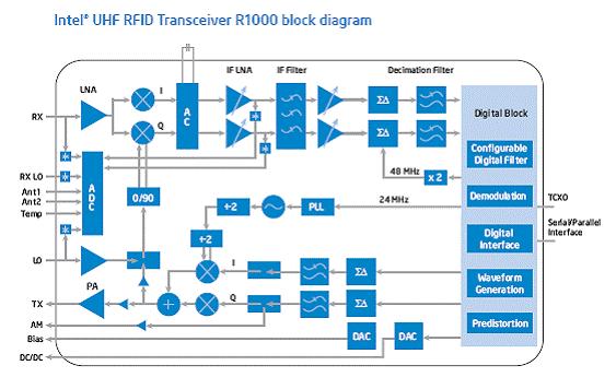 The Intel UHF RFID Transceiver R1000 chip is a highly integrated, high-performance UHF reader radio chip that combines the primary functions of a UHF RFID reader.
