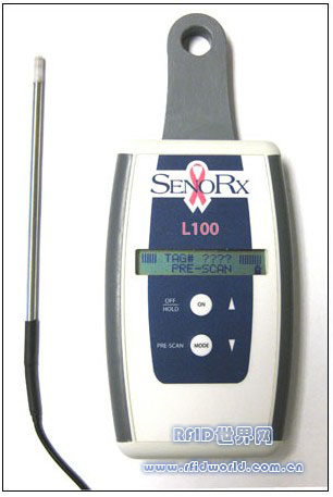 Health Beacons 最早在 08 年 8 月接洽 SenoRx。這套 RFID 系統包括了一個尺寸和形狀相當于米粒大小的可植入標簽、一個標簽植入注射器,及 Health Beacons 提供的一臺手持閱讀器。標簽的 134.2 kHz RFID 嵌體封裝在玻璃管里,符合 ISO 11784 和 11785 標準,玻璃外殼被一個鋼線圈纏繞著,兩個終端各形成一個鉤。線圈和鉤的目的是防止標簽進入體內。