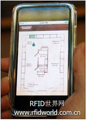 當購物者在 1,100 平方英尺的商店內走動時,標簽發射一個含其唯一 ID 碼的 UWB 信號 (3.1 to 10.6 GHz)。懸掛在賣場上方的 8 支 Time Domain 天線接收到信號,Time Domain 軟件采用三角定位計算購物者的位置,可精確在 1 英尺內,Time Domain 高級銷售和營銷主管 Greg Clawson 稱。位置信息接著通過 Wi-Fi 連接發送到 iPod,iPod 顯示一張商店平面圖,各個標識代表各個顧客的位置。當購物者靠近商店特定區域,安裝這些區域的視頻顯示器展示這個產品的信息,并將信息按照購物者的偏好進行編輯選擇如(外套或長褲)。