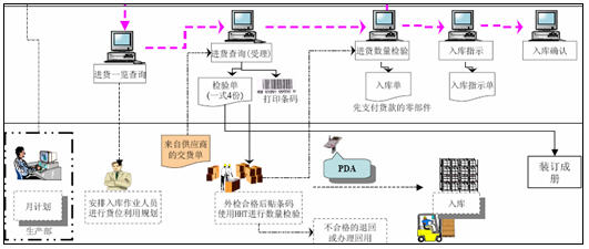 產(chǎn)成品包裝完成并粘貼條碼之后,運(yùn)到倉庫暫存區(qū)由質(zhì)檢部門進(jìn)行檢驗(yàn),質(zhì)檢部門對檢驗(yàn)不合格的產(chǎn)品掃描其包裝條碼,并在采集器上作出相應(yīng)記錄,檢驗(yàn)完畢后把采集器與計(jì)算機(jī)進(jìn)行連接,把數(shù)據(jù)上傳到系統(tǒng)中;對合格產(chǎn)品生成質(zhì)檢單,由倉庫保管人員執(zhí)行生產(chǎn)入庫操作,