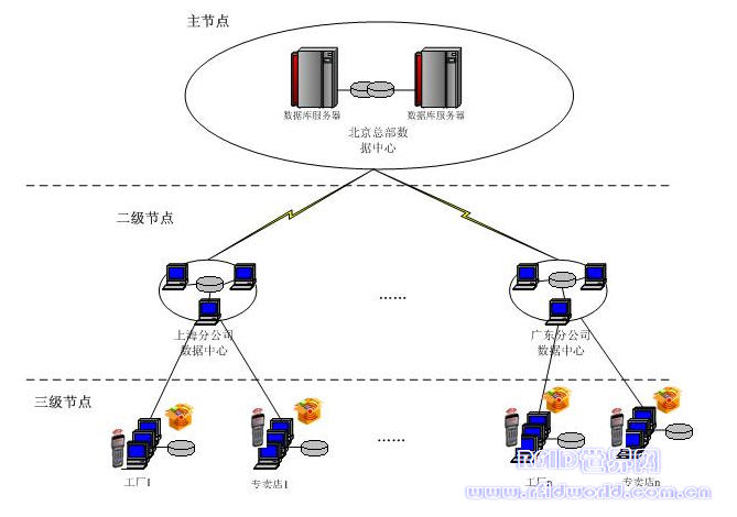如下圖所示是RFID揀貨裝箱系統拓撲架構圖。每個工廠、專賣店通過當地分公司或者直接與總部進行連接。每個工廠建立本地服務器和數據庫,本地數據庫臨時存儲基礎數據和揀貨包裝作業所產生的數據,通過復制或實時傳遞作業數據到總部數據庫中。每個工廠還有固定式RFID硬件設備和打印機、移動RFID設備等硬件設備,通過總線網絡連接到本地服務器。在RFID設備及網絡支持下,運行在工廠本地的聯機事務系統負責接受各RFID設備采集到的RFID標簽事件,經過過濾等處理后形成有效的數據存儲到本地數據庫,然后執行相應的響應,比如打印衣標、打印裝箱單、檢查裝箱條件等。