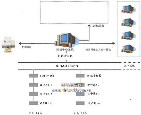 首先在廠區(qū)的各個路口和所有人員可能經(jīng)過的通道中安放若干個讀卡器,具體數(shù)量和位置根據(jù)現(xiàn)場實(shí)際工況和要實(shí)現(xiàn)的功能要求而定,并且將它們通過網(wǎng)絡(luò)布線和地面控制中心的計算機(jī)聯(lián)網(wǎng)。同時在每個工作人員佩帶的一張工作卡(射頻卡),當(dāng)工作人員進(jìn)入廠區(qū)以后,只要通過或接近放置在廠區(qū)內(nèi)的任何一個讀卡器,讀卡器即會馬上感應(yīng)到信號同時立即上傳到控制中心的計算機(jī)上,計算機(jī)馬上就可判斷出具體信息(如:是誰,在哪個位置,具體時間),同時把它顯示在控制中心的大屏幕或電腦顯示屏上并做好備份,管理者也可以根據(jù)大屏幕上或電腦上的分布示意圖點(diǎn)擊廠區(qū)某一位置,計算機(jī)即會把這一區(qū)域的人員情況統(tǒng)計并顯示出來。