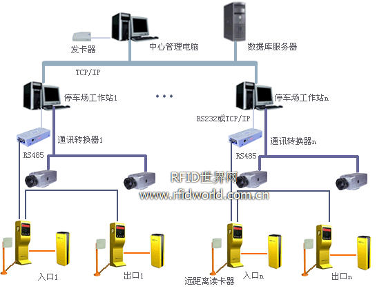 OPEN遠距離停車場管理系統由數據庫服務器、中心管理電腦、停車場工作站、讀卡票箱、道閘、遠距離讀卡器、攝像機以及顯示屏、語音、對講等設備組成,系統支持出入口數量不限,其組合形式非常靈活;針對<3米寬的通道采用高速道閘配合遠距離讀卡,月卡車輛可實現不停車出入停車場。其系統結構圖如下: