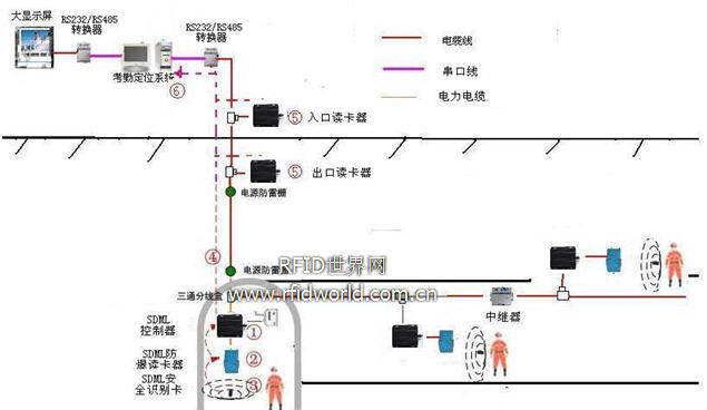 ⑤ 在隧道出入口讀卡器把接收到SDML安全型識(shí)別卡發(fā)送的信號(hào),并通過(guò)RS485接口向數(shù)據(jù)監(jiān)測(cè)分站發(fā)送,從而實(shí)現(xiàn)對(duì)工作人員的考勤。