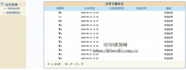在車輛上引進射頻識別卡,由于射頻識別號具有世界上唯一的ID號,不可復制、更改。利用該卡儲存車輛信息,將為車輛建立的唯一數字身份證。當駕駛員攜帶車輛駛出時,系統自動記錄車輛的出車狀態;當車輛回來時,系統將自動更改車輛狀態。出車記錄自動存入歷史記錄中,生成出車報表,并對車輛是否是正常出車、超時違規或者超時已歸進行分類處理。