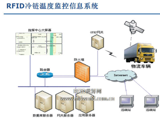 用溫度標簽對冷藏車輛安裝溫度+GPRS車載終端和i-B2標簽:冷庫安裝i-Q32T溫度標簽和讀寫天線,備貨區安裝i-PORT MQ讀寫器并聯網,系統能夠隨時查詢全國冷庫、冷藏車的實時溫度情況,并可實現溫度曲線、歷史記錄、超標自動報警、周報、月報、看報等功能。
