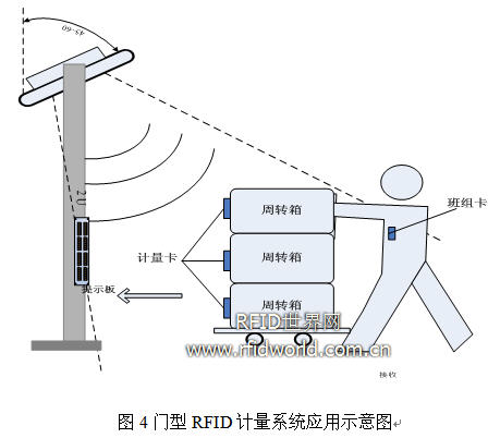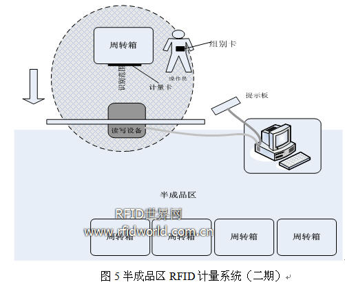 在廣西鞋業的RFID生產制程管控一期實施中,使用了RFID技術進行各工序的計量。其方案如下:在半成品區前面有RFID計量系統,系統的RFID讀寫設備與計算機通過以太網連接。當某個班組完成一定數量的半成品加工后,將規定數量半成品放置在半成品周轉箱內,并在箱上掛計量卡(每張標簽代表一定批次及數量),執行周轉操作的員工同時佩帶班組卡,在經過RFID計量系統進入半成品區時,操作員工首先通過門型計量系統,確認RFID讀寫設備識別到班組卡后,再回來拖動周轉箱通過統計門,RFID讀寫設備識讀所有批量卡。讀寫設備連接的計算機將識讀的班組卡和計量卡信息按對應關系上傳給ERP管理系統。