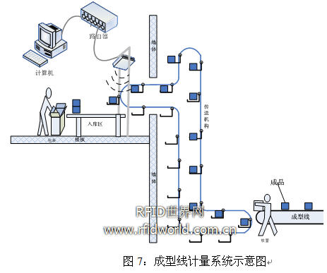 在工廠的生產線工序流程中,成型線的末端連接一個機械傳送機構,該機構將成型線完成的成品傳送到成品倉庫。在傳統的流程中使用人工統計數量,但實際情況中同一天的生產可能有不同批次的成品交替,甚至有返工的批次摻雜在常規批次中,因此經常發生統計錯誤。該流程的信息化改造有使用條碼掃描方案,但是因為同一批次中同規格鞋子的條碼一般相同,因此使用條碼可能發生多次掃描以及漏掃的情況。在一期的RFID生產制程管控方案中使用RFID技術來實現計量統計。