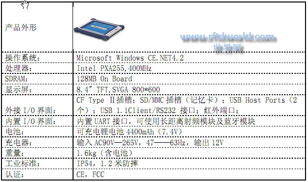 通訊接口 RS232;藍牙Class2 V1.1;無線網符合IEEE802.11b/g標準; GSM/GPRS通信模塊
