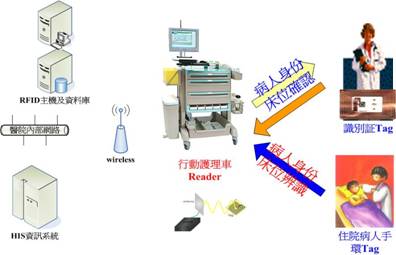 圖2、為護理人員運用病人手圈及行動護理車上之RFID之Reader(或Bar Code),在給藥時配合Unit Dose上之RFID Tag(或Bar Code)進行給藥自動核對及檢查醫(yī)囑異動情形,提升用藥安全。