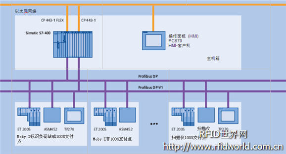 噴漆車間由機(jī)器人(加工底層和頂層涂層)、預(yù)加工設(shè)備、沾漆設(shè)備及車身干燥設(shè)備組成。噴漆車間內(nèi),Simatic控制器S7-416/S7-317為噴漆系統(tǒng)提供自動(dòng)化與控制功能。與控制器連接的有工作用的Simatic TP 270觸屏面板、Simatic ET 200S分布式外圍設(shè)備、ASM 452 Moby RFID接口模塊,它們都是Profibus網(wǎng)絡(luò)的從屬設(shè)備。