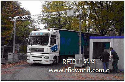 運載貼標門窗的卡車經(jīng)過一個RFID門式閱讀器