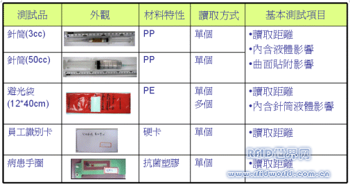 (1) 此次驗(yàn)證主要針對化療用針筒與裝置針筒的紅袋為主,測試多款RFID產(chǎn)品的讀取率、厘清技術(shù)疑點(diǎn),并測試針筒是否因含有液體,而可能干擾讀取效果。因?yàn)榛熕幬锞吒g性,驗(yàn)證過程無法用實(shí)際藥物,改以生理食鹽水取代之。