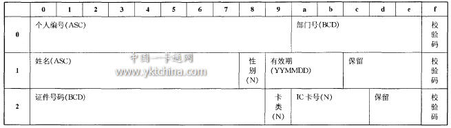 這樣會帶來一個問題,就是二次發(fā)卡.因為學(xué)校自己的扇區(qū)必須學(xué)校自己來寫卡,這樣每張卡銀行發(fā)一次,學(xué)校又要發(fā)一次,給實際的應(yīng)用帶來麻煩.設(shè)置“共享扇區(qū)”可以很好地解決這一問題.所謂“共享”,即與銀行扇區(qū)共享信息:包括卡號、持卡人姓名、學(xué)工號、身份證號、性別、部門等.在銀行發(fā)卡時,將銀行扇區(qū)部分對學(xué)校有用信息復(fù)制到學(xué)校扇區(qū)來,學(xué)??梢员苊舛伟l(fā)卡.具體的寫扇區(qū)數(shù)據(jù)結(jié)構(gòu)可以由學(xué)校來定義,東華大學(xué)“共享扇區(qū)”數(shù)據(jù)結(jié)構(gòu)如圖1所示.個人編號:ASC型,例如:“A20004321” = 0x65 Ox32 Ox3O Ox3O Ox3O Ox34 Ox33 Ox32 Ox3 1;部門編號:ASC一>BCD型,例如:“9212o1”=0x92 0xl2 0x01,其他不再贅述.