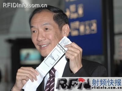 機(jī)場管理局航空客運(yùn)業(yè)務(wù)總經(jīng)理馬耀文先生展示RFID行李標(biāo)簽
