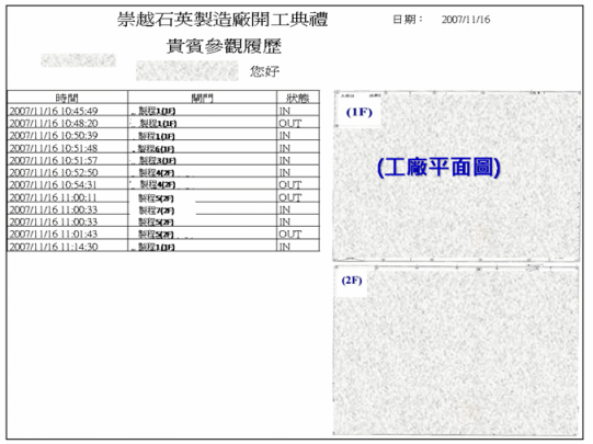 經由NEC團隊半年的規畫、分析、開發、建置,崇越石英RFID入退場管理系統于2007年11月中旬配合崇越石英嘉義新工廠的開工典禮正式啟用。同時在開工典禮過程中也讓主要貴賓配戴貼付RFID標簽的貴賓證實地進行RFID體驗(圖5),參觀新工廠后讓貴賓看到其工廠參觀履歷(圖6),為配合此一”參觀工廠可視化”之實現,NEC團隊更在最短時程內修改軟件,將原本針對作業工單可視化機制改為對貴賓參觀之可視化。參與貴賓在親身體驗RFID科技之余,對此系統留下深刻印象并贊嘆不已。