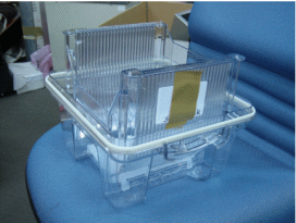 同時需考量此RFID卷標貼附位置能滿足所有RFID應用流程,我們實驗結果是貼在晶圓盒內層拖盤(圖17)上方,同時RFID標簽也會存放晶圓批號等廠內品管作業流程所需代號。