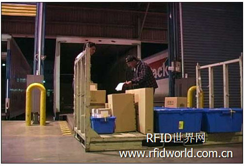 在裝載臺(tái),一臺(tái)RFID閱讀器讀取卡車?yán)锩總€(gè)塑料集裝箱的標(biāo)簽