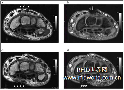 在 MRT 掃描中,研究人員也在一位自愿者身上進行測試,發(fā)現(xiàn) RFID 標簽對自愿者的 MRI 圖像確實有些影響。自愿者將標簽粘在手腕上,MRI 成像時,標簽位置產(chǎn)生一個陰影,但是尺寸十分微小,不足影響這類診斷檢測的質(zhì)量。舉個例子,標簽會干擾標簽所貼處皮膚的能見度,但其它部分仍然清楚可見。因此,研究人員不建議將標簽粘貼 MRT 需要重點掃描的部位。