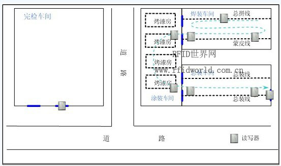 在涂裝車間的涂裝上線點(diǎn)、涂裝下線點(diǎn)分別設(shè)置一臺(tái)超高頻RFID讀寫(xiě)器,用于對(duì)進(jìn)入涂裝車間生產(chǎn)線的車輛進(jìn)行信息采集,并將信息通過(guò)以太網(wǎng)絡(luò)實(shí)時(shí)回傳至后臺(tái)管理系統(tǒng)。