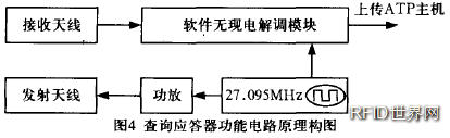 查詢應(yīng)答器由地面應(yīng)答器、車載查詢器、發(fā)射天線、軌旁電子單元LEU (可變應(yīng)答器才有,用于列車控制中心為地面應(yīng)答器傳送臨時可變信息)四部分組成。地面應(yīng)答器的電源取自正在通過的機車上的查詢器發(fā)射的27.095MHz信號,地面應(yīng)答器利用對該頻率點的電感耦合取得工作所需能量。地面向機車傳輸數(shù)據(jù)的載頻為4.237MH z,可以確保列車高速通過瞬間完整讀出數(shù)據(jù)報文。當(dāng)機車駛過地面應(yīng)答器時,車載查詢器首先通過電磁感應(yīng)方式將能量傳遞給地面應(yīng)答器,地面應(yīng)答器在接收到來自列車的能量后開始工作,通過整流電路提供可靠的電源,為應(yīng)答器工作提供能量,將報文數(shù)據(jù)以頻移調(diào)制方式通過電磁感應(yīng)傳送至車上。其基本電路原理框圖如圖3所示。