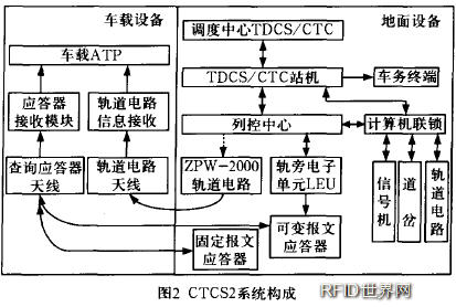 隨著第六次大提速的實施,速度將突破160km/h達(dá)到200~250km/h,列車必須裝設(shè)列車控制系統(tǒng);TDCS/CTC等系統(tǒng)的應(yīng)用,傳統(tǒng)的區(qū)域分散控制轉(zhuǎn)變?yōu)榻y(tǒng)一指揮,對臨時限速設(shè)置方式等帶來了革命性的變化,需要為運行中的列車提供臨時限速信息。立足于我國既有信號技術(shù)裝備, 參照歐盟ET C S相關(guān)標(biāo)準(zhǔn),我國自主研發(fā)了完全擁有自主知識產(chǎn)權(quán)、符合我國國情的CTCS2級列車控制系統(tǒng)實施方案:通過軌道電路提供與前車(目標(biāo))距離和進(jìn)路狀態(tài)等實時連續(xù)信息,由列車控制中心控制應(yīng)答器發(fā)送線路參數(shù)、進(jìn)路信息和臨時限速,列車車載設(shè)備自動生成連續(xù)速度控制模式曲線,實時監(jiān)控列車安全運行,巧妙地解決了信息連續(xù)要求和信息量的矛盾。CTCS2系統(tǒng)構(gòu)成如圖2所示。