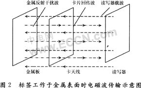 普通RFID標簽直接貼附于金屬表面上,由于金屬表面對入射電磁波的反射作用,將會有較強的反方向電磁波也穿過電子標簽。入射波與反射波相位疊加后將會抵消一部分,強度也會大大削弱,嚴重影響讀寫器對RFID標簽的讀取距離,甚至無法讀取和RFID標簽上的數據,如圖2所示。同時,讀寫器與RFID標簽間產生的磁通量會在金屬表面感應渦流,根據楞次定律,渦流對讀寫器的磁場起反作用,致使金屬表面上的磁場被強烈地衰減了。