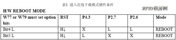W78E516 內建一個64K 字節的主ROM 區,來存儲應用程序(APROM),和一個4K的輔助ROM 區用于存儲裝載程序(LDROM)。在正常運作方式下,控制器執行APROM中的代碼。如果要更改APROM 中的代碼,W78E516 允許用戶通過硬件連接方式,來使控制器進入在線下載模式即跳轉到4K 區程序執行。進入在線下載模式硬件條件如下表1:
