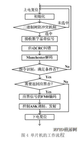 單片機的工作流程如圖4所示,①當標簽進入閱讀器的射頻場后,芯片上電復位;②單片機完成初始化;③啟動二進制樹防沖突單元,讀取“Select”標志位,如果等待一定時間后未被選中,則返回①狀態,繼續等待,如果收到“選中”指令,則繼續下一步;④接收檢波電路送來的數字基帶信號;⑤啟動CRC糾錯電路;⑥對基帶信號進行Manchester解碼;⑦對信號中的指令進行識別,如果發現滿足指令執行的條件,就執行閱讀器指定的操作,并根據通信協議,決定是否返回應答信號,反之,則向閱讀器發出出錯信息,并將工作狀態返回至初始狀態;⑧對應答信號進行FM0編碼;⑨控制射頻端的ASK調制和發射;⑩保持一定時間的靜默后,進入下電復位狀態。