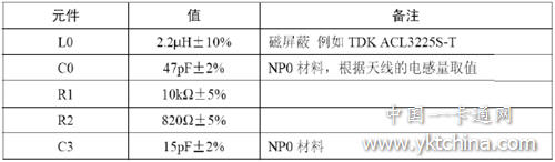 EMC低通濾波器由L0和C0組成。Mifare系統(tǒng)在13.56MHz頻率下操作。該頻率由一個(gè)石英晶振產(chǎn)生用于驅(qū)動(dòng)MFRC500以及作為驅(qū)動(dòng)天線的13.56MHz能量載波的基頻。這樣除了產(chǎn)生13.56MHz的發(fā)射功率而且會(huì)發(fā)射更高的諧波。國(guó)際EMC條例定義了在廣播頻段中發(fā)射功率的幅值。因此,必須對(duì)輸出信號(hào)進(jìn)行適當(dāng)?shù)臑V波。接收電路由R1、R2、C3、C4組成。使用了內(nèi)部產(chǎn)生的VMID電勢(shì)作為RX腳的輸入電勢(shì)。為了提供一個(gè)穩(wěn)定的參考電壓,還必須在VMID腳接一個(gè)對(duì)地的電容C4。讀卡器的接收部分在RX和VMID腳之間連接了一個(gè)分壓器。天線線圈和分壓器之間使用了一個(gè)串接電容。EMC低通濾波器和接收電路的元件取值見下表1: