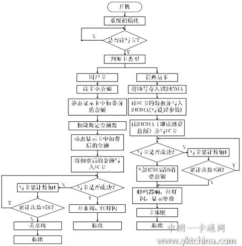系統(tǒng)初始化包括了單片機(jī)的初始化、讀24C01A操作、顯示處理、以及MFRC500初始化。其中讀24C01A操作是為了顯示單價(jià)的需要,MFRC500的初始化即對(duì)MFRC500的內(nèi)部寄存器進(jìn)行設(shè)置。當(dāng)有IC卡靠近讀寫器時(shí),先讀取系統(tǒng)識(shí)別碼(判斷該卡是否適用于該系統(tǒng)),然后判斷卡類型并進(jìn)入相對(duì)應(yīng)的用戶卡或管理員卡處理流程。在用戶卡以及管理員卡處理流程中考慮長(zhǎng)期使用可能出現(xiàn)壞卡,因而設(shè)置有寫卡累計(jì)次數(shù)限制流程,如果寫卡累計(jì)6次仍不能成功則退出并報(bào)警。