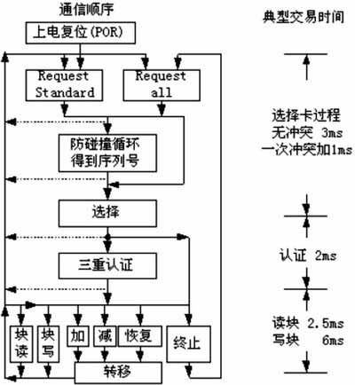 BL75R06芯片通過天線與讀卡器進行交互,由讀卡器發送命令,通過BL75R06內部的數字邏輯控制模塊,根據要訪問的相應扇區的訪問控制條件來決定命令的可操作性,并發送相應的信息或數據。讀卡器向工作區射頻場內所有的卡發送請求響應的命令,智能卡在上電后,根據ISO/IEC14443A協議的ATQA,可以響應請求命令。在防沖突循環過程中,讀卡器讀出卡的ID序列號,如讀卡器在其工作范圍內有幾張卡時,可通過唯一的卡ID序列號來識別,并選中其中一張卡作為下一步操作的對象,沒被選中的卡返回到待命模式,等待下一個請求命令。讀卡器發出選卡命令后,選中一張卡來認證并對相關存儲器進行操作,卡返回ATS代碼,該代碼表示被選中卡的類型。卡選中后,讀卡器根據要訪問的存儲器位置,采用響應的密匙來進行三重相互認證過程,認證通過后,對存儲器的操作都是加密的。在認證通過后即進行讀塊、寫塊、加、減、恢復、轉移、終止的操作。加是將塊中的內容加上一個值,并把結果保存到一個臨時的數據寄存器中;減是將塊中的內容減去一個值,并把結果保存到一個臨時的數據寄存器中;恢復是將塊中內容移到臨時的數據寄存器中;轉移是將臨時寄存器中的內容寫到指定的塊中。讀卡器和智能卡的無線通信是采用信息塊的16位CRC,以及對每個字節帶一個奇偶校驗位來保證數據傳輸的可靠性的。讀卡器和智能卡通信工作交易流程如圖3所示。