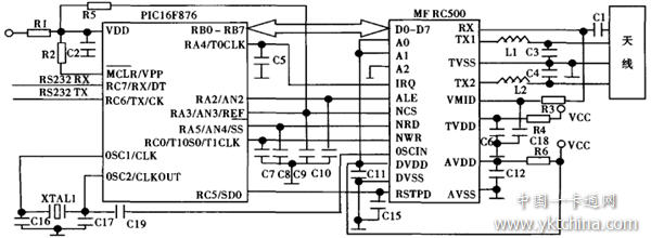 圖2所示為IC卡讀寫器的硬件連接圖。系統所使用的硬件主要由2部分組成:PIC16F876單片機與芯片MF RC500組成。該系統采用PIC16F876單片機為控制核心,主要完成數據采集、處理、存儲及控制系統工作的功能,通過RB El與MF RC500的數據總線相連,可實現與非接觸式IC卡數據的無線傳輸。RC7、RC6用來連接RS232,最終與計算機相連。RK3作為MF RC500的片選端,低電平有效。RK5、RC0分別控制MF RC500的讀寫,RA4接收來自非接觸式IC卡的中斷請求并執行中斷程序。該系統的工作頻率為13.56 MHz,由石英晶體振蕩器產生,用于給MF RC500提供時鐘信號,同時也驅動天線基頻載波信號。MFRC500是與非接觸式IC卡實現無線通信的核心模塊,也是IC卡讀寫器讀寫非接觸式IC卡的關鍵接口芯片。它根據寄存器的設定對發送緩沖區中的數據進行調制,得到發送的信號,通過由TX1、TX2腳驅動的天線以電磁波的形式發出去,非接觸式IC卡采用RF場的負載調制進行響應。MF1卡放在距離射頻天線100mm內,天線拾取非接觸式IC卡的響應信號,經過天線匹配電路送到RX腳,MF RC500內部接收緩沖器對信號進行檢測和解調,并根據寄存器的設定進行處理。處理后的數據發送到并行接口由單片機讀取。