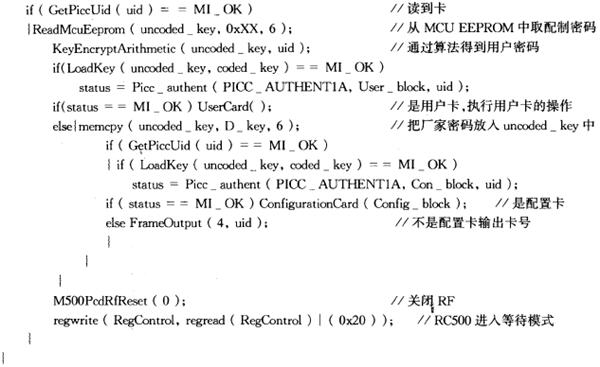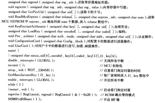 程序采用標準C語言編制,以PCW C Compiler IDE編譯器為開發環境,以下是部分程序源代碼以及子函數說明。該程序代碼在PIC16F876單片機上測試通過。程序將RF場適時的開啟與關閉,大大降低了MCU與RF場的功耗,同時減少了在讀卡過程中MF RC500對MCU的干擾。