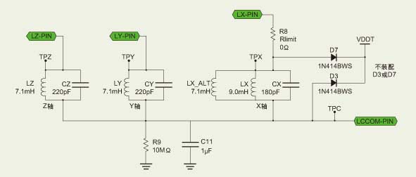 PIC16F639器件具有三個(gè)低頻輸入通道。LCX、LCY和LCZ引腳用于連接(每個(gè)LF輸入通道的)外部LC諧振天線電路。外部電路連接至天線輸入引腳及LCCOM引腳。對(duì)所有外部天線電路而言,LCCOM是共用引腳。當(dāng)內(nèi)部檢測電路檢測到強(qiáng)輸入信號(hào)時(shí),建議在LCCOM引腳與地之間接一個(gè)電容(1~10μF),以提供穩(wěn)定的工作狀態(tài)。