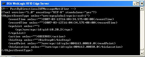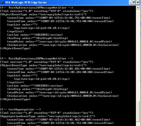此外,可以將EPCIS events 捕獲到EPCISCapture queue,其需要的配置的地方有工作流模塊的消息通告目的URI和XSLT的設(shè)置。由于文章篇幅限制,在這里不再具體配置。讀者可以自行察看Enterprise Server的電子文檔,來(lái)參考實(shí)現(xiàn)這部分功能。其URL如下:http://edocs.bea.com/rfid/enterprise_server/docs20/index.html