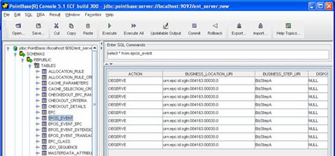 對(duì)于上面的操作,可以通過(guò)執(zhí)行“select * from epcis_event”查詢,察看數(shù)據(jù)庫(kù)對(duì)Event Data的持久存儲(chǔ)情況,如下所示: