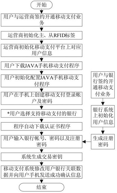 基于RFID的GPRS移動支付業務的開通流程如圖2所示。用戶需要分別在移動運營商和銀行注冊開通移動支付業務,然后在手機上下載、安裝JAVA手機移動支付程序,并對程序進行初始化配置,生成安全支付的交易密鑰。如果用戶開通多家銀行的移動支付業務,則需要重復操作“*”以下的操作。基于RFID的 GPRS移動支付業務的日常刷卡消費支付流程如圖3所示。