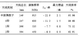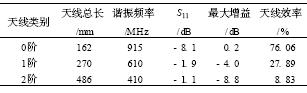 從圖3和表1可以看出,相對于相同縱向長度的普通偶極子天線,隨著分形階數的增加, 0~2階二維Hilbert標簽天線的方向圖基本保持不變,但諧振頻率逐漸減小: 2階二維Hilbert標簽天線的諧振頻率約為410MHz,若要保持諧振頻率為915MHz,則2階二維Hilbert標簽天線的等邊長度約為0. 46 h.