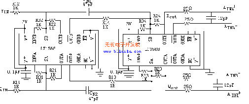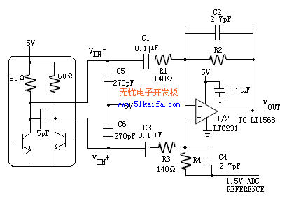 RF解調器采用了凌特公司的LT5516芯片,該芯片直接轉換解調器800MHzZH至1.5GHz的頻率范圍。LT5516超群的線性提供了對低電平信號的高靈敏度,即使在很大的干擾信號下也不會受到影響。運算放大器采用了凌特公司的LT6231芯片,該芯片起一個差分至單端放大器的作用,用于驅動低通濾波器的單端輸入。LT5516的差分I或Q輸出轉換為一個單端輸出的LT6231差分放大器。電路如圖2所示。