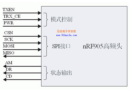 圖2中給出了由nRF905組成的高頻頭用戶接口,該接口由10個數(shù)字輸入/輸出I/O組成,按照工作可分為三組: