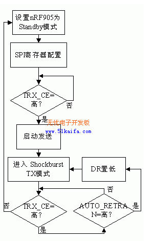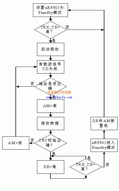 由于與RF協(xié)議相關(guān)的高速信號處理部分已經(jīng)嵌入在模塊內(nèi)部,高頻頭可與各種低成本單片機配合使用,也可以與DSP等高速處理器配合使用;高頻頭提供一個SPI接口,速率由微控制器自己設(shè)定的接口速度決定。在RX模式中,地址匹配(AM)和數(shù)據(jù)準(zhǔn)備就緒(DR)信號通知MCU一個有效的地址和數(shù)據(jù)包已經(jīng)各自接收完成,微控制器即可通過SPI讀取接收的數(shù)據(jù)。在TX模式中,高頻頭自動產(chǎn)生前導(dǎo)碼和CRC校驗碼,數(shù)據(jù)準(zhǔn)備就緒(DR)信號通知MCU數(shù)據(jù)傳輸已經(jīng)完成。這意味著降低MCU的存儲器需求也就是降低MCU成本,同時縮短軟件開發(fā)時間。nRF905接收模式如圖4所示,nRF905發(fā)射模式如圖5所示。