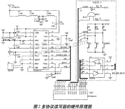 如圖2所示,多協(xié)議讀寫器的硬件構(gòu)成:單片機(jī)ATmega16、MLX90121、讀寫器接口電路。天線的設(shè)計(jì)本文不作討論。