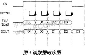 圖3中,MLX9012l將從標(biāo)簽中讀到的信息取出后生成輸入信號(input signal),經(jīng)過大數(shù)判決(MV,majority voting)電路啟動,在時(shí)鐘(CK)上升沿開始由DOUT 口向MCU發(fā)送數(shù)據(jù),發(fā)送時(shí)采取低位先送。在每個(gè)數(shù)據(jù)同步信號(DSYNC)下降沿取出數(shù)據(jù)。在最后一個(gè)DSYNC信號上升沿,CK信號拉低結(jié)束數(shù)據(jù)輸出。
