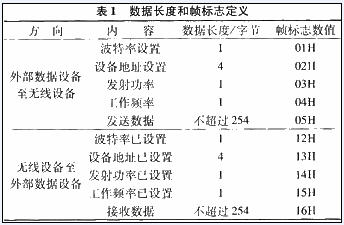 外部數據設備與無線數據傳輸設備間的雙向數據傳輸使用相同的幀格式,幀格式由幀頭、幀長、幀標志和數據組成。幀頭為數據幀開始標志,固定為0FF81H,長度2字節。幀長指從幀標志開始至本幀結束的所有數據的字節數,不包括幀頭、幀長本身,單位為字節,幀長占1字節。幀標志用以指示本幀數據的內容屬性,長度為1字節。不同類型幀的數據長度和幀標志具體定義如表1所示。