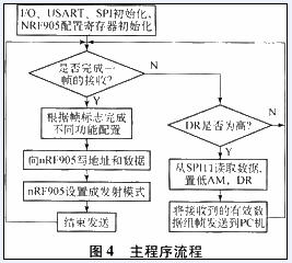 當nRF905接收到有效數據后,DR置高,單片機檢測到DR為高電平后,復位TRX_CE引腳,使nRF905進入空閑模式,通過SPI接口從nRF905中讀出接收數據,然后通過USART傳送給PC機或其他外部沒備。