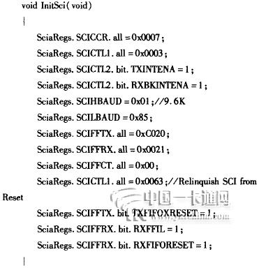 本系統(tǒng)中各模塊問的通信都采用RS-485通信。而這實際利用串口通信加上一塊MAX485芯片將串口通信變換成RS-485通信來實現(xiàn)的。因此本節(jié)介紹一下TMS320C2812的串口通信的實現(xiàn)過程。TMS320C2812的SCI口除具有普通串口的特點外,還具有以下特點:發(fā)送和接收均有一個16級深度的FIFO,可編程64K種不同的波特率,可編程8—16位數(shù)據(jù)長度,空閑線和地址位兩種喚醒多處理器模式,奇偶校驗、過載、幀錯誤和問斷監(jiān)測共4個錯誤檢測標(biāo)志,半雙工或全雙工操作模式,可工作于中斷或查詢方式,具有獨立的接收和發(fā)送中斷使能位。利用TMS320C2812的SCI口進行串行通信主要有查詢和中斷兩種模式。中斷模式下需要選擇中斷優(yōu)先級和設(shè)置中斷使能位,除此外,兩種方式都需要設(shè)置操作方式和協(xié)議、字符長度、奇偶校驗、停止位的位數(shù)以及波特率值等操作。所有這些操作都是通過設(shè)置寄存器來實現(xiàn)的。本設(shè)計系統(tǒng)中采用中斷方式實現(xiàn)系統(tǒng)的通信。下面是采用中斷方式進行通信的串口初始化程序: