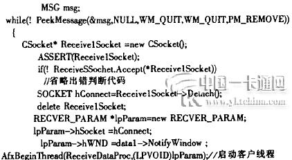 本地服務器軟件啟動后。首先建立監聽服務線程。用于監聽掌上電腦的連接請求.即用來啟動服務程序.在本軟件中是通過菜單來啟動的.建立一個新的線程使用函數AfxBeginThread(Re.ceiveSeivice。&data)來實現,第一個參數為線程函數的執行體的函數名。第二個參數為傳遞給此線程的數據結構。用于向該線程給出一些具體的數據.成功執行此函數后.線程函數便獨立于主程序運行.直至正常退出或被異常中斷.以下是關鍵代碼:
